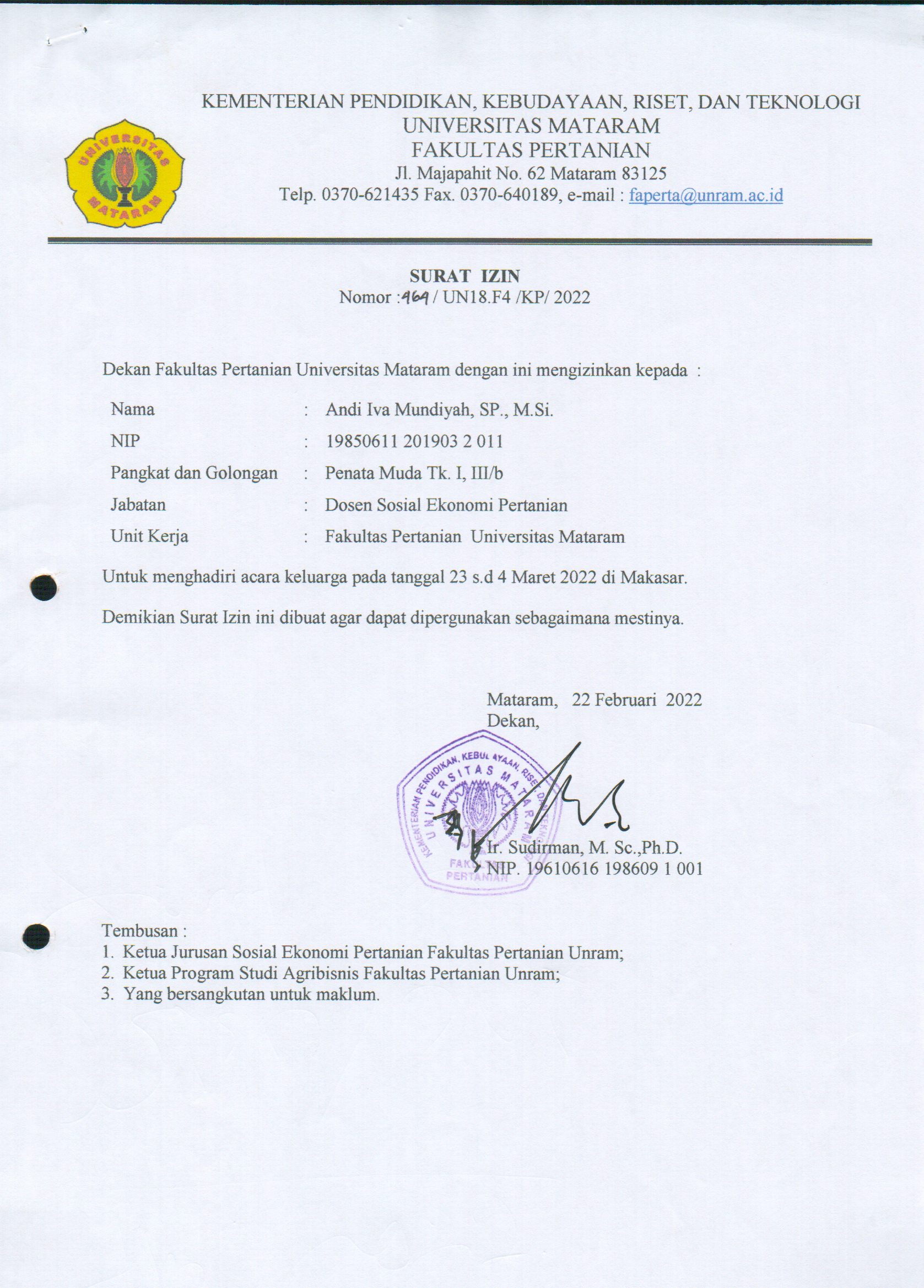 Tanggal Dokumen: 09/08/2022Surat Izin a.n. Andi Iva Mundiyah, SP., M.Si. untuk Menghadiri acara keluarga pada tanggal 23 s.d 24 Maret 2022